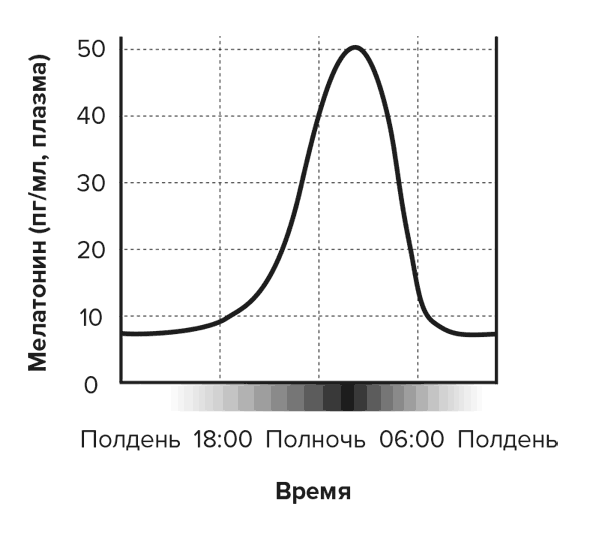 На рис. 2 вы видите типичные показатели выработки мелатонина. Она начинается через несколько часов после наступления сумерек, затем быстро увеличивается, достигая пика около четырех часов утра. Чем ближе рассвет, тем интенсивнее снижается секреция мелатонина, падая к утру до неизмеряемого уровня.