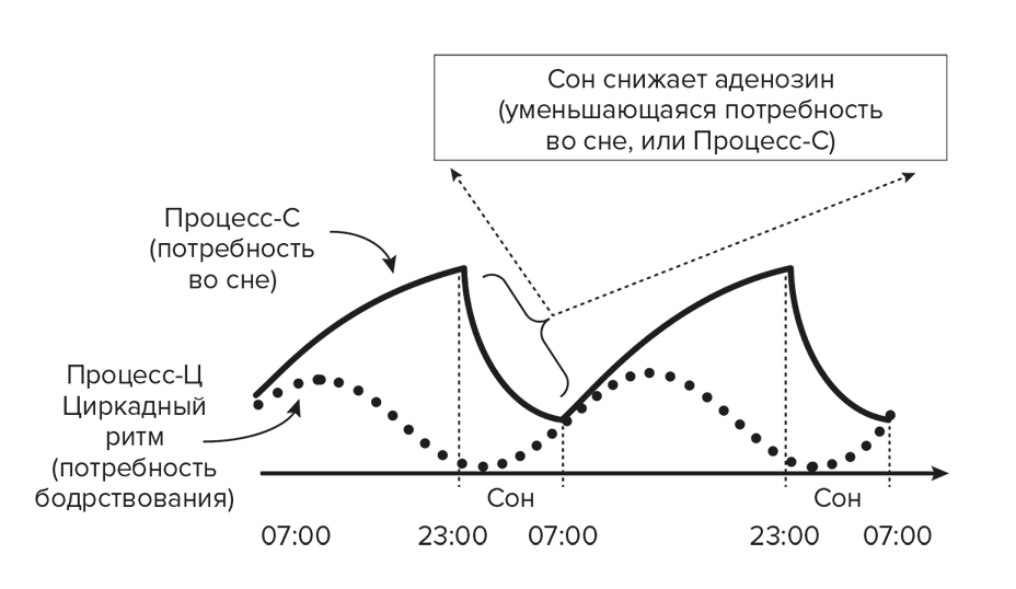 Ваш суточный циркадный ритм – первый из двух факторов, определяющих режим бодрствования и сна. Второй – потребность во сне. Именно в этот самый момент в вашем мозге накапливается химическое вещество, называемое аденозин. И с каждой минутой бодрствования его концентрация будет увеличиваться. Чем дольше вы бодрствуете, тем больше аденозина накапливается в вашем организме. Подумайте об аденозине как о химическом таймере, который непрерывно регистрирует количество времени, прошедшего с того момента, как вы проснулись утром.