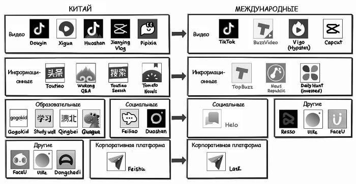 Серые иконки означают, что приложение в последнее время закрыто. Более полный список семейства приложений ByteDance – в конце книги.