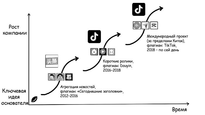Каждый этап развития выстраивался непосредственно на продуктах и технологиях, разработанных на предыдущей стадии. Успех TikTok был обусловлен репликацией практики его внутрикитайской сестры Douyin – ее технологий, ее опыта работы с продуктом и схем продвижения. А успех Douyin, в свою очередь, был основан на рекомендательной системе, опыте работы и денежных резервах новостного агрегатора Toutiao – приложения, чье название известно в Китае даже ребенку. И наконец, что не менее важно, успех Toutiao был плодом дальновидности и решительности основателя ByteDance Чжана Имина.