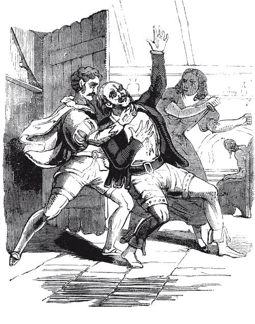 Этот прозрачный намек привлек внимание двух кавалеров, которые, занимая два табурета по правую руку от прохода, прислонялись спиной к седьмой колонне от кафедры. Оба были молоды и одеты пышно. Услышав женский голос, взывавший к их учтивости, они прервали беседу и посмотрели на говорившую. Она откинула покрывало, чтобы яснее рассмотреть внутренность храма. Волосы у нее были рыжие, она косила. Кавалеры отвернулись и возобновили разговор.
