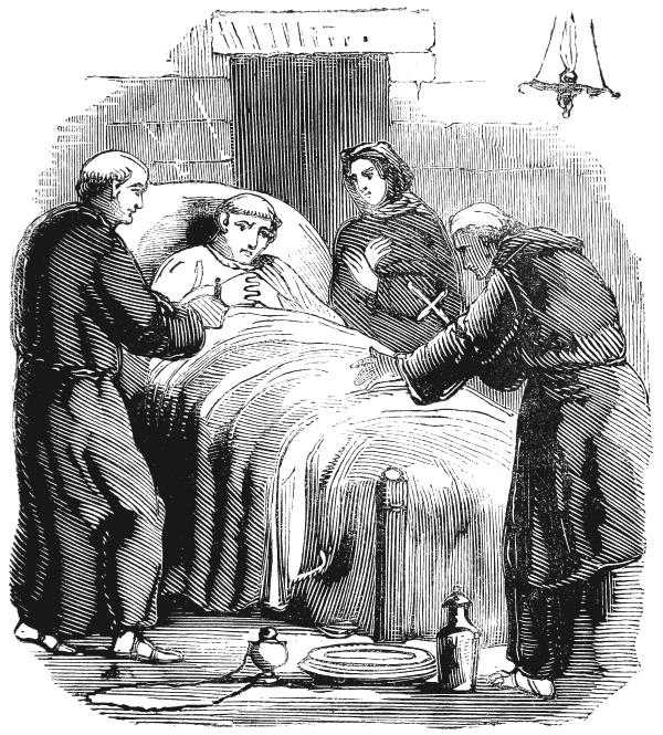 Отчаяние ее было неописуемым. Она рвала на себе волосы, била себя в грудь и, не решаясь оставить Амбросио, громкими воплями призывала на помощь. Наконец несколько братьев, встревоженные ее криками, поспешили в сад, и настоятеля перенесли в его келью. Его немедля уложили в постель, и монах-врачеватель приготовился осмотреть укушенную руку. К этому времени она необыкновенно распухла. Его напоили целебными отварами, и к нему вернулась жизнь, но не рассудок. Он тяжко бредил, на его губах клубилась пена, и четверо самых сильных монахов с трудом удерживали его в постели.