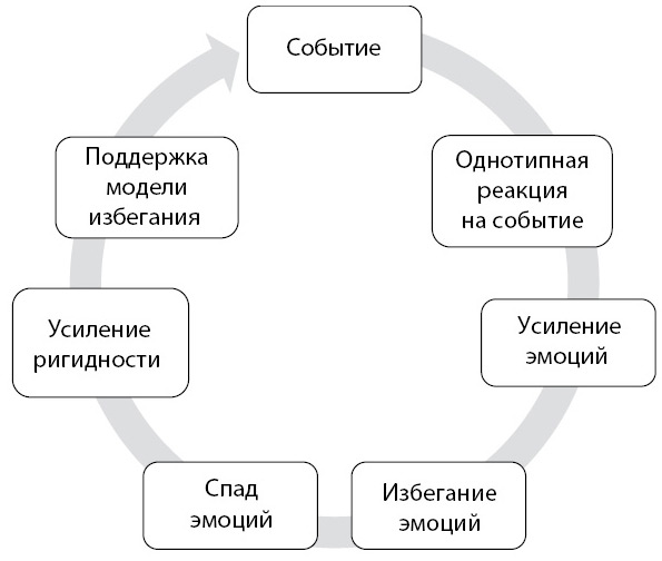 Ригидность эмоциональной системы приводит к избеганиюНа рис. 1.1 вы видите типичный замкнутый круг, в который вас заводит ригидность эмоциональной системы. Допустим, происходит что-нибудь нерядовое. Вы реагируете на него определенным образом: прослеживается некая закономерность в мыслях, поведении и распределении внимания. Эмоциональная ригидность усиливает ваш отклик на проблемную ситуацию. Тревога или подавленность постепенно возрастают, и вы начинаете избегать обстоятельств, которые запускают такие сильные эмоции.