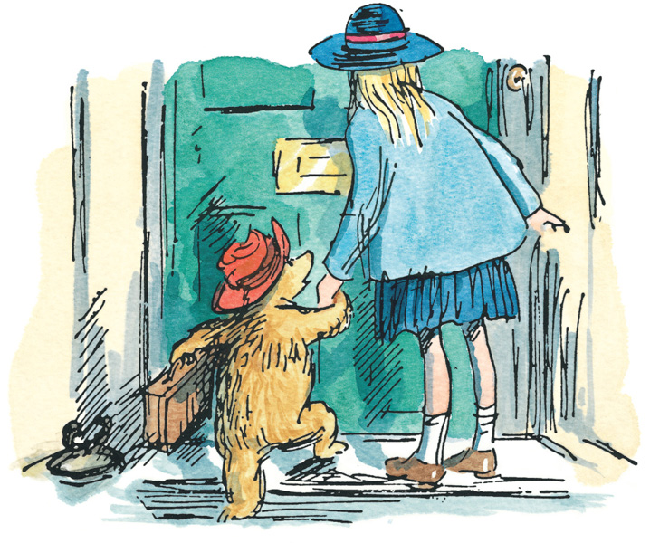 Paddington looked thoughtful. It wasn’t so much that he didn’t like baths; he really didn’t mind being covered with jam and cream. It seemed a pity to wash it all off quite so soon. But before he had time to consider the matter the taxi stopped and the Browns began to climb out. Paddington picked up his suitcase and followed Judy up a flight of white steps to a big green door.
