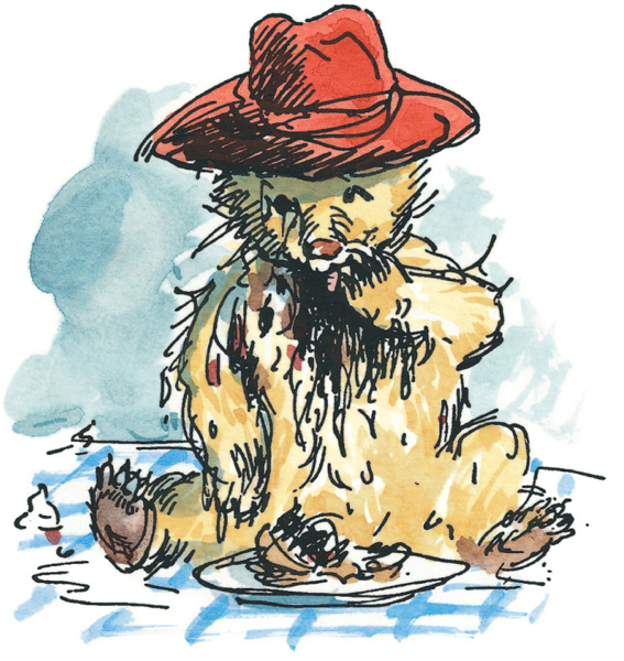 Paddington, who didn’t think it at all funny, stood for a moment with one foot on the table and the other in Mr Brown’s tea. There were large patches of white cream all over his face, and on his left ear there was a lump of strawberry jam.