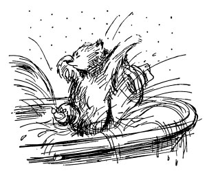 It wasn’t until a trickle of warm water landed on his nose that he realised the bath was full and was beginning to run over the side. With a sigh he climbed up on to the side of the bath, closed his eyes, held his nose with one paw, and jumped. The water was hot and soapy and much deeper than he had expected. In fact, he had to stand on tiptoe even to keep his nose above the surface.