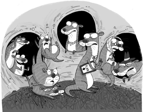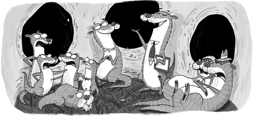 The young otters all began squabbling, which they often did, having spent their whole lives sharing one small chamber between the five of them. And they were squabbling so ferociously they missed Papa’s big news. He pressed his paws either side of his whiskers and yelled it again at the top of his voice.