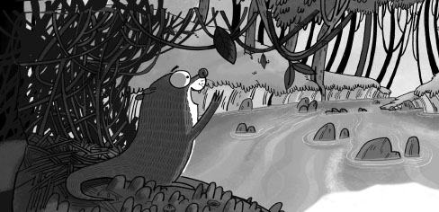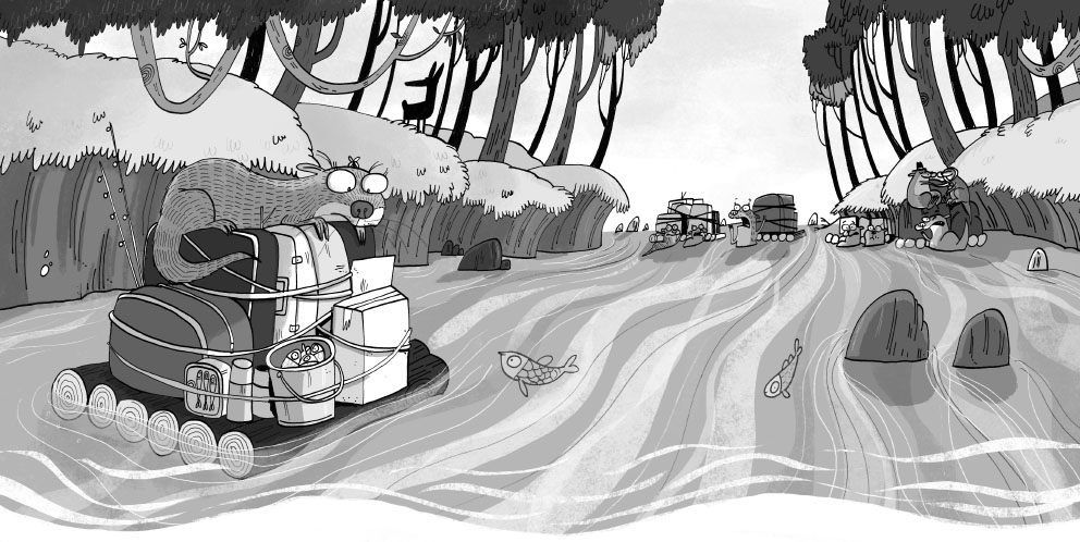Woody leapt out of bed and hurried to his parents’ chamber, which was empty, so he swam out of the den and up to the surface to find the riverbank full of thin branches and reeds. Mama and Papa were busy building rafts by moonlight.