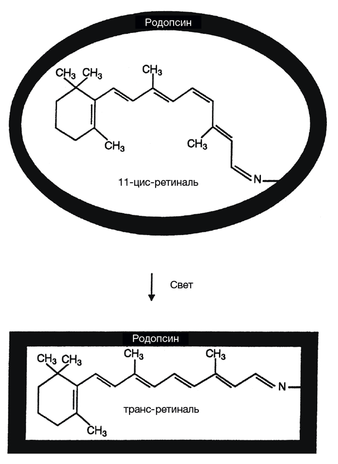 В конце концов трансретиналь отпадает от родопсина, он должен снова превратиться в 11-цис-ретиналь и быть связанным родопсином, чтобы вернуться в исходную точку и запустить очередной зрительный цикл. Для этого трансретиналь сначала химически модифицируется ферментом в трансретинол – форму, которая содержит еще два атома водорода. Затем второй фермент преобразует молекулу в 11-цис-ретинол. Наконец, третий фермент удаляет ранее добавленные атомы водорода, чтобы получился 11-цис-ретинол, и цикл завершается.