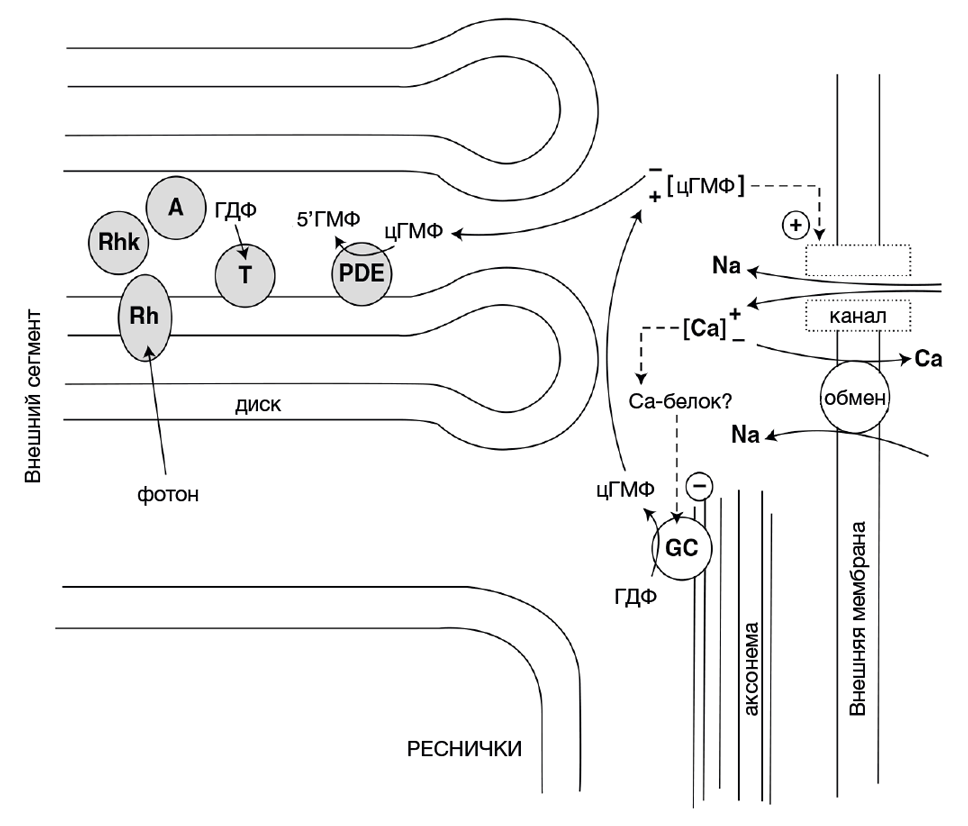 Биохимия зрения. Rh – родопсин, RhK – родопсинкиназа, A – аррестин, GC – гуанилатциклаза, T – трансдуцин, PDE – фосфодиэстераза