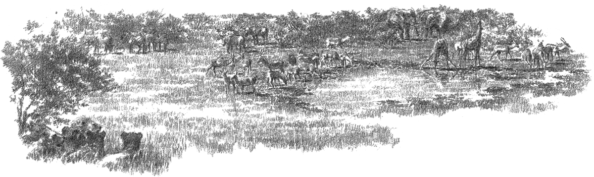 There was a waterhole downhill from the farmhouse, and some distance away. That waterhole, when there was water in it, became Bertie’s whole world. He would spend hours in the dusty compound, his hands gripping the fence, looking out at the wonders of the veld, at the giraffes drinking, spread-legged, at the waterhole; at the browsing impala, tails twitching, alert; at the warthogs snorting and snuffling under the shade of the shingayi trees; at the baboons, the zebras, the wildebeests, and the elephants bathing in the mud. But the moment Bertie always longed for was when a pride of lions came padding out of the veld. The impala were the first to spring away, then the zebra would panic and gallop off. Within seconds the lions would have the waterhole to themselves, and they would crouch to drink.