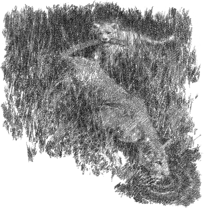 While the lioness drank, the cub played at catching her tail; and then, when she had had her fill, the two of them slipped away into the long grass and were gone.