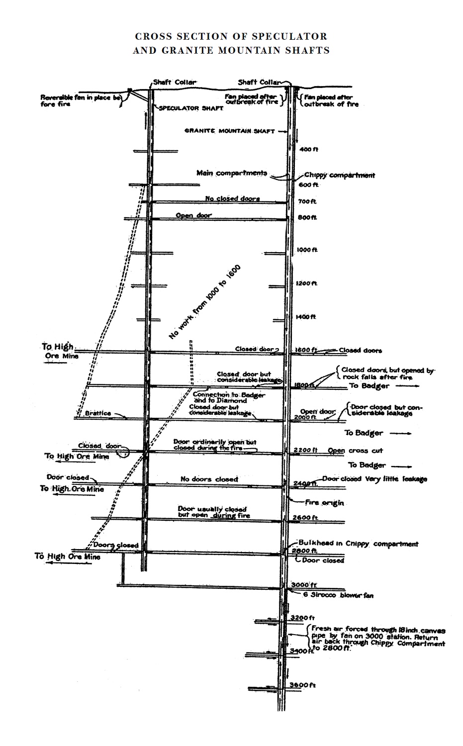 The flames spread rapidly through the tangled cable, the frayed wire like a 1,200-foot fuse. To make matters worse, the Granite Mountain shaft had a powerful downdraft. Under normal circumstances, air circulated down the Granite Mountain shaft, then traveled sideways through numerous “crosscuts” to its sister shaft, the Speculator. The Spec, an updraft, drew the air back up to the surface. Air in this system moved at a breezy 200 to 300 feet per minute, making the Granite Mountain and Speculator shafts among the best ventilated in Butte.8 This circulation, normally beneficial, now turned deadly. In the initial moments after flames broke out, the Granite Mountain downdraft sucked the fire into the mass of cable, then fanned the growing conflagration.9