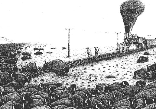 As the train glided along the tracks, Grinnell heard the sudden screech of metal brakes and excited shouts. Looking out the window, he saw a herd of buffalo. After a brief delay, the herd wandered off and the voyage continued. Later, though, the train was halted a second time by another herd. “We supposed they would soon pass by,” remembered Grinnell, “but they kept coming … in numbers so great that they could not be computed.” It took three hours for the herd to cross the tracks.1 In the early days of the railroad, the problem of buffalo blocking tracks was so common that engines were sometimes equipped with a device that shot out steam to scatter the herd.