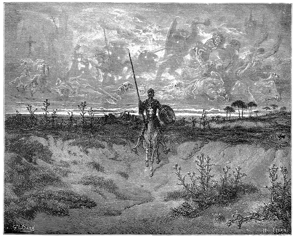 Окончив эти приготовления, наш идальго решил тотчас же привести в исполнение задуманное им, так как его угнетала мысль, что промедление даст себя чувствовать миру, приняв в расчет все те обиды, которые он думал уничтожить, несправедливости – исправить, злоупотребления – искоренить, ошибки – загладить и долги – уплатить. Не сообщив никому о своем намерении и так, чтобы никто его не видел, однажды утром, еще до рассвета (так как это был один из самых жарких июльских дней), он надел все свои доспехи, сел верхом на Росинанта, опустил плохо прилаженное забрало, продел на руку щит, взял свое копье и выехал из задней калитки двора в поле, донельзя довольный и обрадованный тем, что ему так легко удалось положить начало доброму своему желанию. Но едва он очутился в поле, как у него мелькнула страшная мысль, и такая страшная, что она чуть было не заставила его отказаться от начатого дела, а именно: он вспомнил, что еще не был посвящен в рыцари и что по рыцарским законам он не может и не должен сражаться ни с кем из рыцарей. Допустив же, что он был бы посвящен в рыцари, ему, как новичку, следовало бы иметь лишь «белое» оружие, без девиза на щите, пока он не заслужит его собственными подвигами. Эти мысли заставили его поколебаться в своем намерении, но так как его безумие было сильнее всяких других доводов, он решил просить первого, кто встретится ему, посвятить его в рыцари, в подражание многим другим, которые поступили таким же образом, как он это прочел в книгах, столь сильно завладевших им. Что же касается «белого» оружия, он решил, когда окажется время, так основательно вычистить свои доспехи, чтобы они стали белее горностая. Все это успокоило его, и он поехал дальше, предоставив лошади своей идти, куда она пожелает, думая, что в этом и состоит вся тайна приключений.