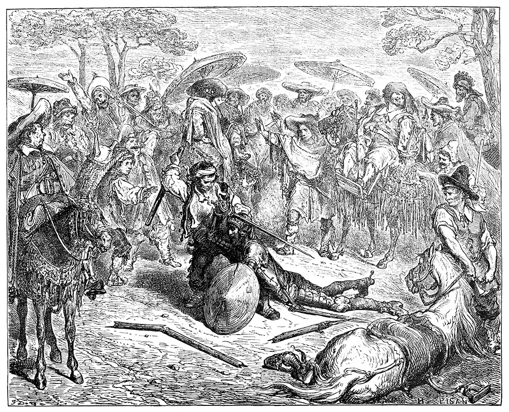 Увидав то, что происходит, Дон Кихот гневным голосом воскликнул: