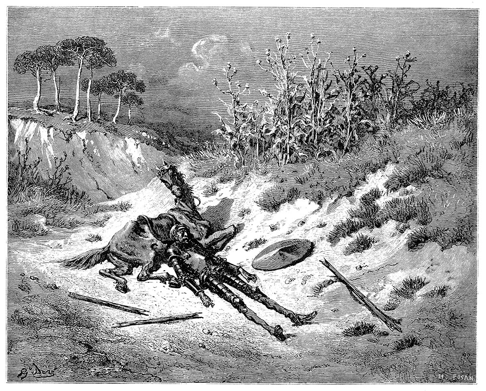 – Недостойный рыцарь, не пристало вам нападать на того, кто не может защищаться! Садитесь сейчас на своего коня, берите копье (так как у крестьянина также оказалось копье, прислоненное к дубу, к которому привязана была кобыла), и я докажу вам, что одни лишь трусы могут так поступать, как вы.