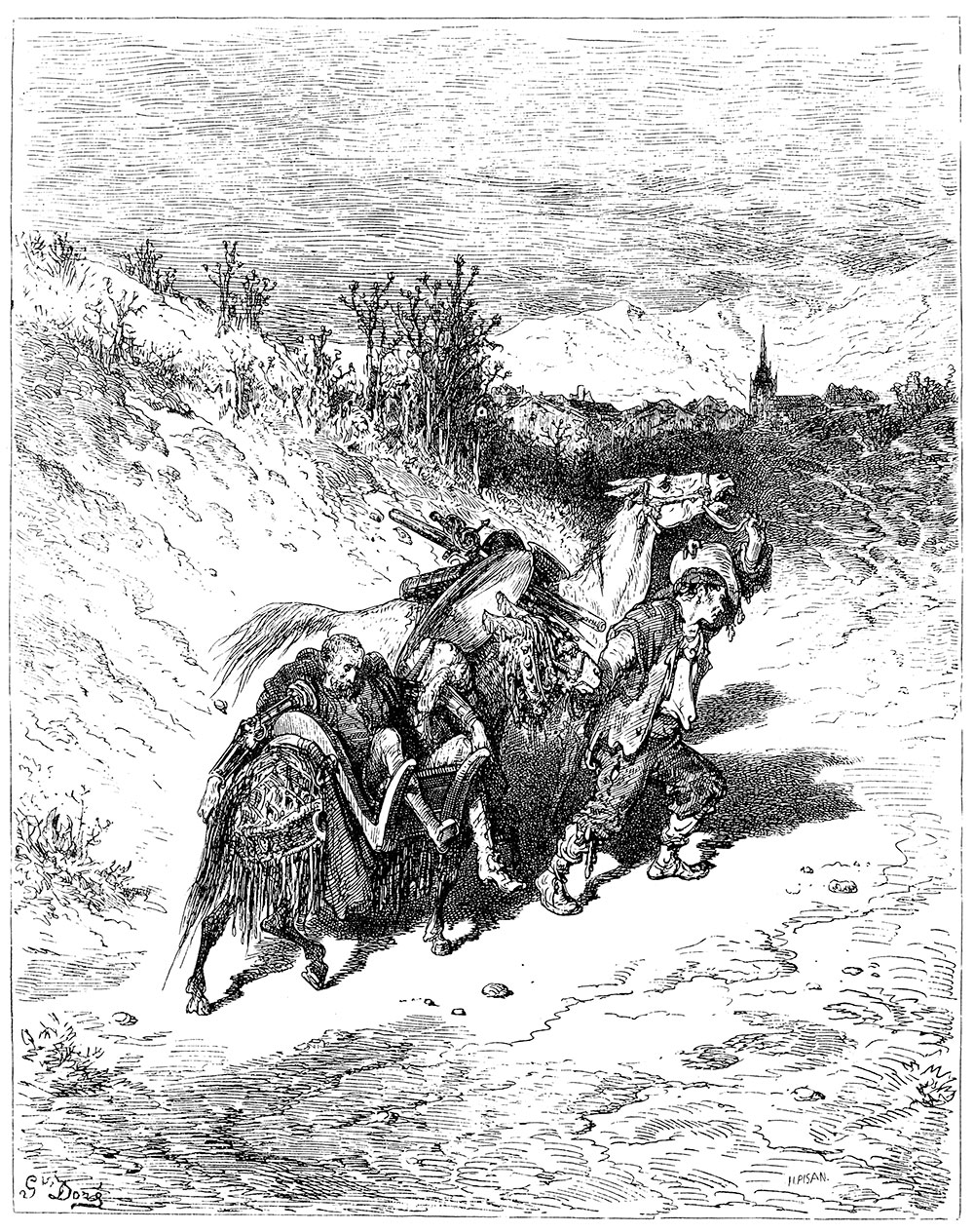 Прельстившись этими и тому подобными обещаниями, Санчо Панса (так звали крестьянина), оставив жену и детей, поступил на службу к своему соседу. Тотчас же Дон Кихот стал приискивать деньги и, продав одно, заложив другое, терпя во всем убытки, собрал довольно значительную сумму. Он запасся также и круглым щитом, взяв его на время у одного из своих приятелей, и, починив как можно лучше сломанный шлем, уведомил оруженосца своего, Санчо Пансу, о дне и часе, когда он думает пуститься в путь, чтобы и он мог запастись всем необходимым, и, главным образом, велел ему взять с собой сумки[5]. Санчо сказал, что возьмет их, а также рассчитывает взять с собой и своего осла, очень хорошего, потому что он не привык ходить много пешком. Относительно осла Дон Кихот несколько задумался, стараясь припомнить, сопровождал ли какого-нибудь рыцаря оруженосец верхом на осле, и не мог припомнить ничего подобного. Тем не менее он позволил Санчо взять осла и решил, лишь только подвернется случай, снабдить его более почетным верховым животным, отняв коня у первого дерзкого рыцаря, который ему встретится. Он запасся также рубашками и всем, чем мог, следуя совету, который ему дал хозяин постоялого двора.