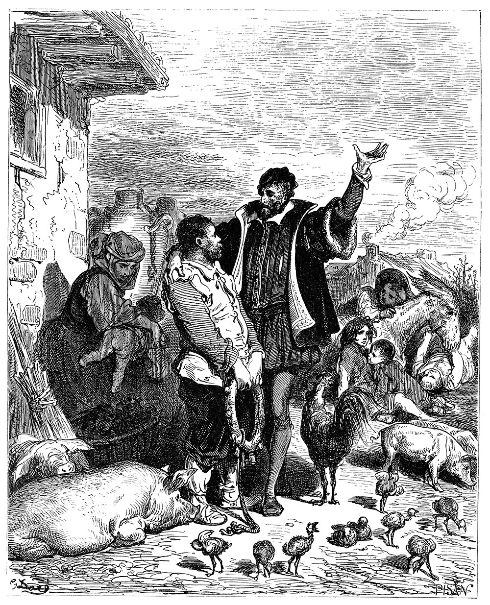 Между тем Дон Кихот осаждал своими просьбами одного крестьянина, своего соседа, человека почтенного (если так можно назвать того, кто беден), но не блистающего умом. Дон Кихот столько наговорил ему, столько наобещал, так долго и много убеждал его, что бедный крестьянин наконец решился ехать с ним и служить ему в качестве оруженосца. Между прочим, Дон Кихот говорил ему, что ему следовало бы по собственной охоте сопровождать его, так как легко может случиться, что ему встретится такого рода приключение, когда он во мгновение ока приобретет какой-нибудь остров и назначит его там губернатором.