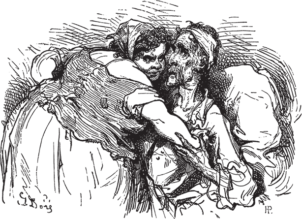 На беду, Мариторнес понадобилось что-то на чердаке. Осторожно, стараясь не шуметь, она поднялась наверх. Но едва она переступила порог, как Дон Кихот, заслышав ее шаги, присел на кровати и стал ждать ее приближения. Пробираясь в темноте, астурийка действительно чуть не наткнулась на его кровать, и наш благородный кабальеро успел схватить ее за руку. Испуганная Мариторнес тщетно пыталась вырваться, но Дон Кихот усадил ее на край своей кровати и тихо и нежно произнес: