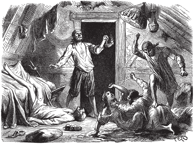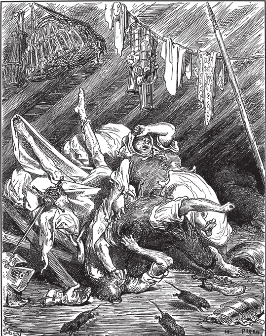 В эту минуту напиток оказал, наконец, свое действие. Обливаясь холодным потом, Санчо корчился в таких страшных судорогах, что не только он сам, но и все присутствующие думали, что ему пришел конец. Мучения Санчо длились около двух часов, и он настолько ослабел, что едва мог держаться на ногах.