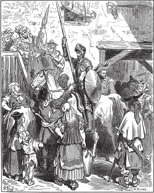 Все многочисленные обитатели постоялого двора собрались посмотреть на отъезд Дон Кихота. Была тут и дочка хозяина, с которой наш кабальеро не спускал глаз. Временами у него из груди вырывались тяжкие, глубокие вздохи. Присутствующие решили, что он вздыхает от боли в боках, так, по крайней мере, думали все те, кто накануне вечером видел его синяки и ссадины.