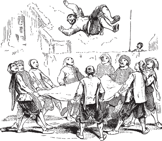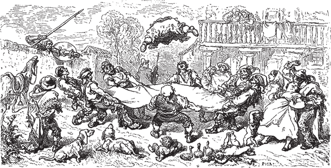 На беду несчастного Санчо, на постоялом дворе ночевало четверо сукновалов из Сеговии, трое торговцев из Кордовы да еще двое проходимцев из Ярмарочного околотка в Севилье. Все они были веселые, разудалые ребята и большие шутники. Они слышали слова Санчо и решили расправиться с ним по-свойски. Мигом обступили они несчастного оруженосца и стащили его с седла. Один из них сбегал за хозяйским одеялом; парни положили беднягу на это одеяло и принялись подбрасывать его высоко в воздух.