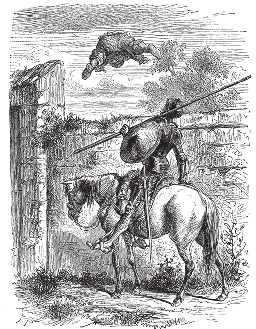 Крики страдальца были так пронзительны, что достигли слуха его господина. Сначала Дон Кихот решил, что ему подвернулось какое-то новое приключение, но вскоре узнал голос своего оруженосца. Он повернул коня и поскакал обратно к постоялому двору. Подъехав ближе, Дон Кихот увидел веселую игру, затеянную с его оруженосцем. Санчо так забавно кувыркался в воздухе, что сам Дон Кихот, наверное, расхохотался бы, если б не был так разгневан. Он бросился на выручку несчастному, однако ворота были заперты; тогда он решил перелезть через забор, но у него не хватило сил даже на то, чтобы соскочить с коня.