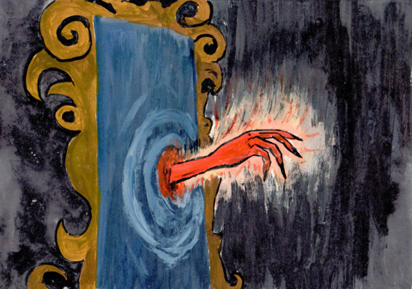 Юг подошёл к зеркалу, а старик стал протягивать ему свою костлявую руку, но как только рука старика вышла из-за стекла, она стала как раскалённое железо. Рука пылала огнём и тянулась к Югу, тот протянул свою руку, и рукопожатие свершилось. Юг завопил так, что девочка, наблюдавшая за этим, побоялась оглохнуть. Это был вопль и вой. Юг стоял на коленях и сквозь стон, произнёс: