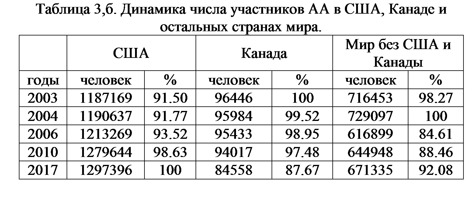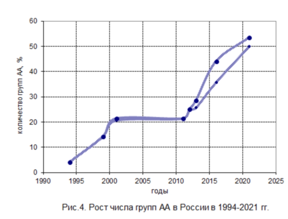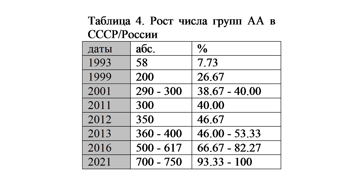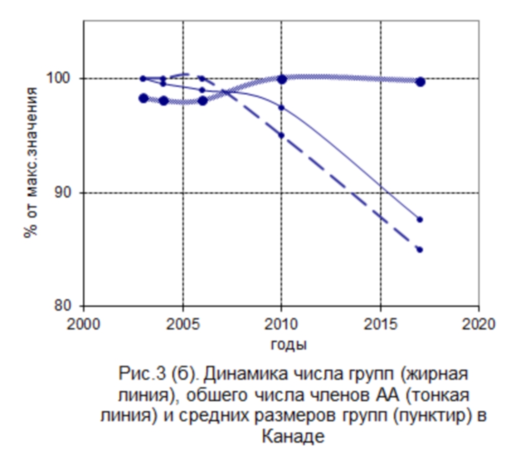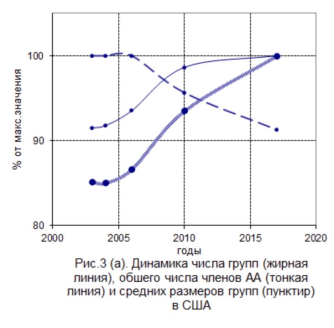 Во вторых, как в США, так и в России доля устойчиво выздоравливающих, т.е. продолжающих посещать группы АА/АН и поддерживать с ними более или менее постоянные контакты на протяжении 2 лет и более, имела тенденцию к постоянному снижению: если на первых порах (в 1930-40-е гг. в США и в 1980-1990-е гг. в России) доля таких выздоравливающих достигала отметки 75%, то к настоящему времени она и тут и там снизилась до 10% (при среднем разбросе 8-11%) («Размышление №1, №6»).