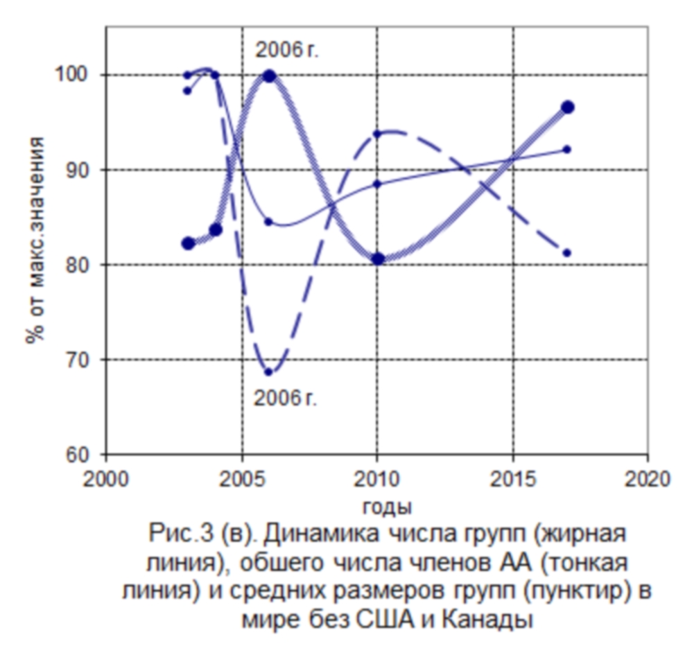 Начать это рассмотрение можно с отмеченного выше кратковременного всплеска числа групп АА в мире, наблюдаемого в период 2006-2010 гг., за которым последовал столь же стремительный симметричный спад.