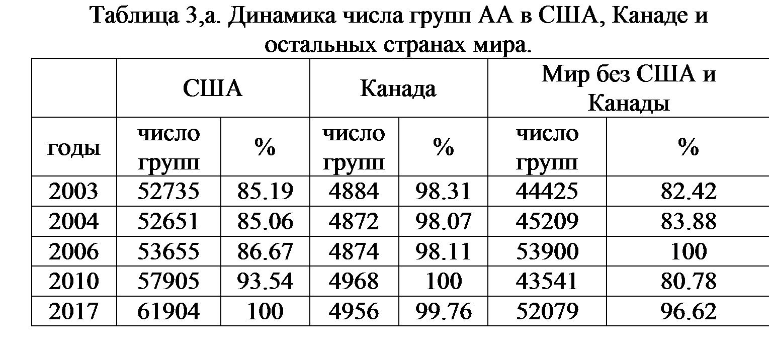 Во-первых, следует выяснить, был ли этот всплеск действительно «всемирным», или же он имел локальный характер? Поскольку данных о количестве групп АА по отдельным странам мне найти не удалось, пришлось ограничится данными, взятыми из тех же источников, в которых отдельные графы имеется только для двух стран – США и Канады, в то время как данные по всем остальным странам приводятся в совокупности, как «все остальные» (Папка АА, 2004-2018; БК, 1939-2011; см. табл.3,а).
