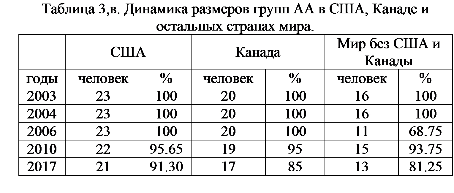Имея данные о числе групп и численности анонимных алкоголиков, несложно вычислить средний размер групп АА (см. табл.3, в).