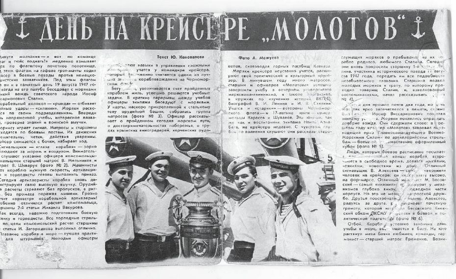 В моем архиве хранится старый, истрепанный номер журнала «Огонек», изданный в 1949 году. Мне подарил его Виктор Андреевич Любимов. На фотографии у орудий своей знаменитой башни он и четверо его матросов с кубком Главкома. И надпись под снимком: «19 августа 1947 года на палубе крейсера «Молотов» беседовал с моряками великий вождь советского народа Иосиф Виссарионович Сталин.