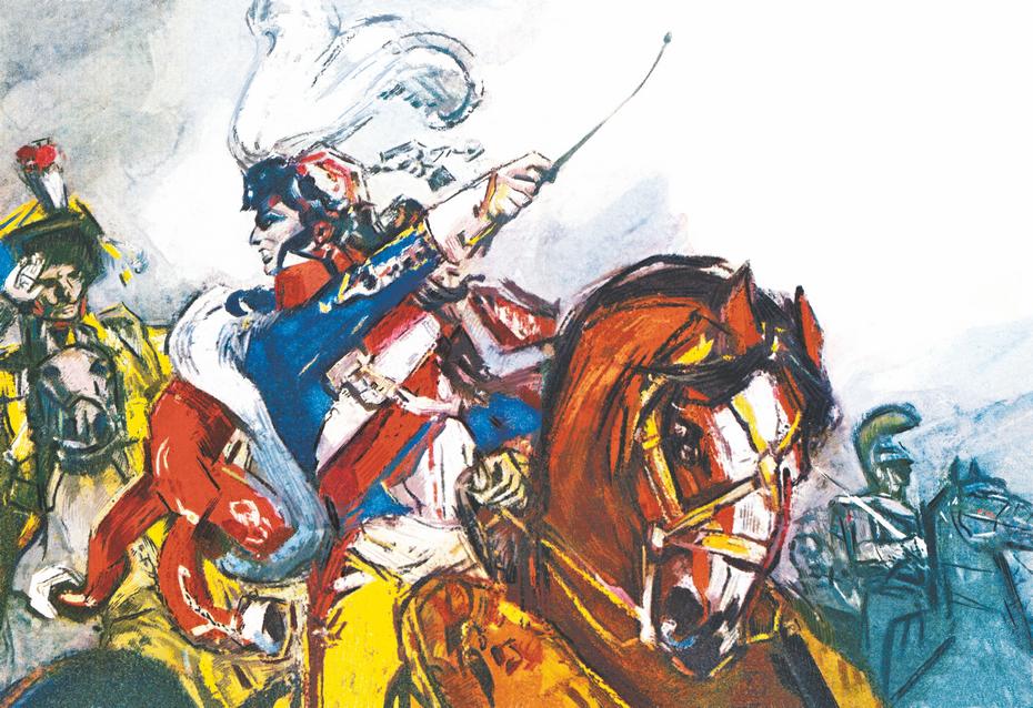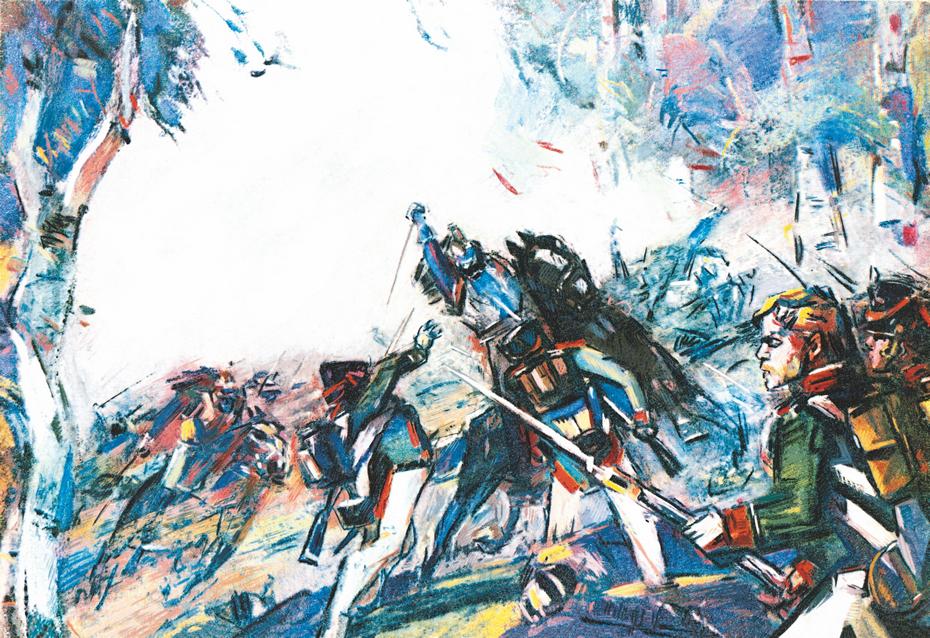 Мюрат развернул своих гусаров в широком поле и карьером повёл их в атаку на русскую пехоту. И вдруг из-за деревьев ударил в упор залп… другой… третий… На всём скаку стали падать кони, через их головы летели всадники. Массы кавалерии всё же домчались до дороги, и тут французы увидели за берёзами стальную щетину штыков.
