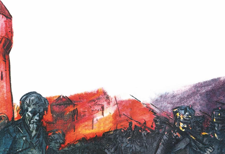 Под их огнём запылал весь город. Горели дома и магазины, амбары и сараи. Среди огня, в дыму и пыли метались жители, плакали дети, стонали раненые.