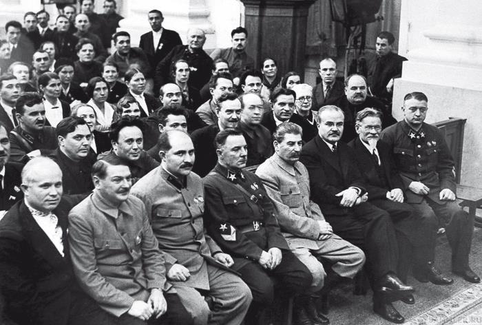 В первом ряду – Никита Хрущев, Андрей Жданов, Лазарь Каганович, Иосиф Сталин, Вячеслав Молотов, Михаил Тухачевский