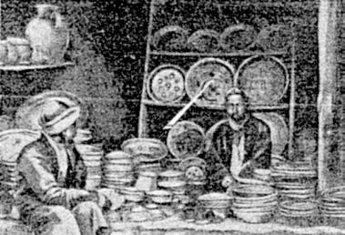 Посудная лавка в Оше. Начало 20 в. Рисунок из книги «Ошская область, энциклопедия», Фрунзе, 1987 г.