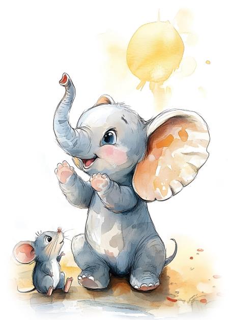 Втянет хоботом песочек,Камушков найдёт штук пять —Высыпает. Так с часочекПродолжал Малыш играть.Вдруг мышонок, вскинув лапки,Пискнул: – Нет нигде травы?Из неё сплели бы шапки,Вреден жар для головы.Ухом голову прикрывши,Всё играл Малыш в песок.Поискал мышонок крышу —Под второе ухо лёг.И вот так, прижавшись тесно,Продолжал Гигант лежать…Затянул слонёнок песню,Чтобы скуку разогнать.И Гигант-мышонок пискомМалышу стал подпевать,Звонко, весело и чистоСтали песенку слагать:Как внезапно подружились,Как же здорово вдвоём…И в конце концов решили:Жизнь зовёт – вперёд идём!