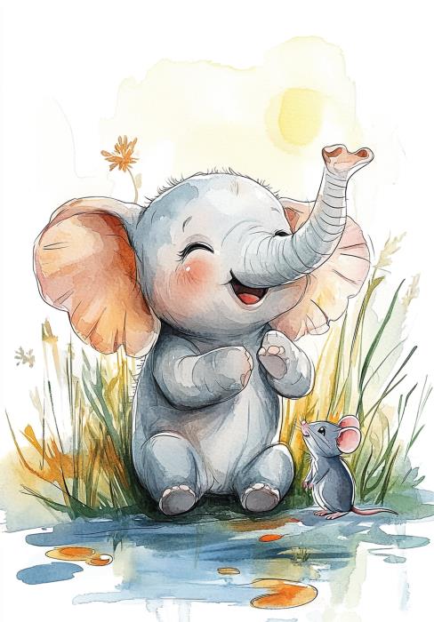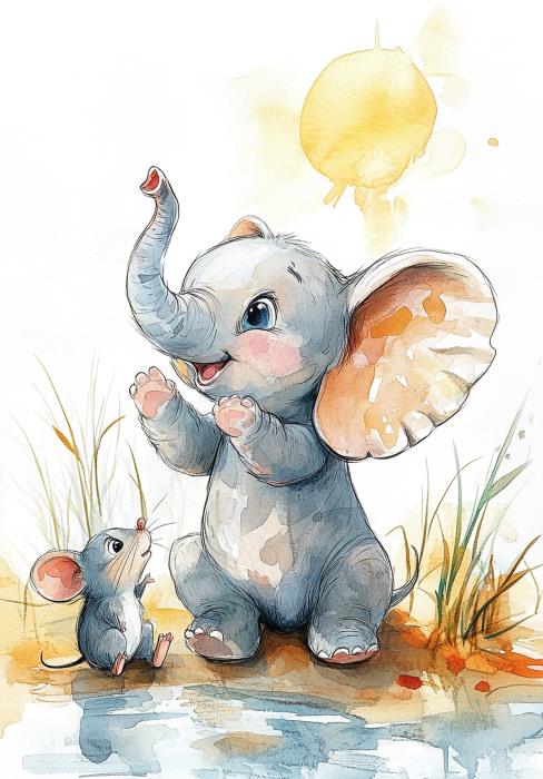 Ясным днём слонёнок с мышкойПовстречались на пруду.Слон окликнул: – Эй, малышка!Я от смеха упаду.Ну куда ты лезешь в воду?Булькнешь – я не помогу.Повредил себе я ногу.Вот, сижу на берегу.Но мышонок, нос задравши,Пропищал ему в ответ:– Я из всех собратьев старший,Не мешай мне – мой совет.Из мышат я самый смелый,Да и ростом выше всех.Имя мне – Гигант (за дело),Придержи свой глупый смех.