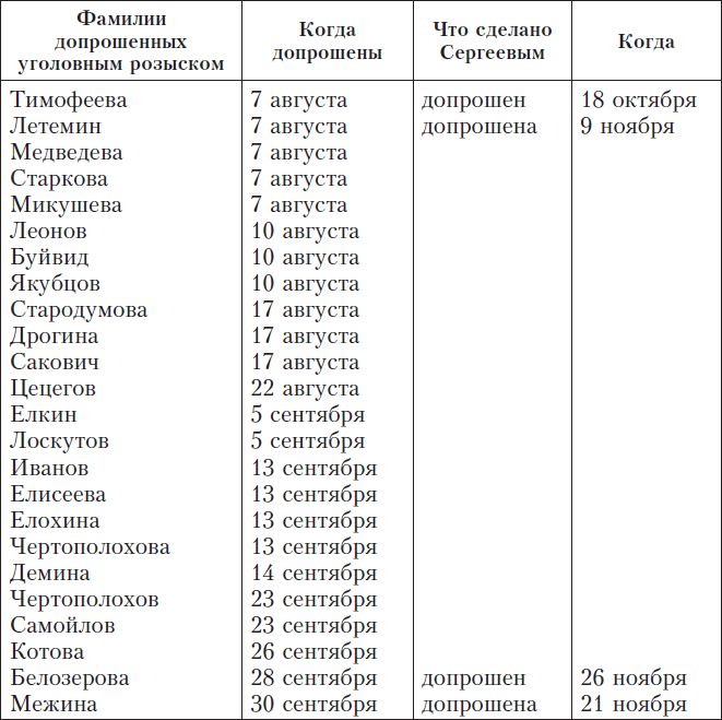 Сергеев резко отзывается в своей докладной записке о моральных качествах чинов Екатеринбургского уголовного розыска и указывает на то, что они не стояли на должной высоте. Сергеев, оправдывая себя, отмечает, что «успех следствия в значительной мере обусловлен возможно наилучшей и широкой постановкой дознания и розыска, ибо результаты работы органов дознания являются основой предварительного следствия». Последнее Сергеев должен был добавить – при условии, когда розыск руководится следствием и следователем. При всем том делал ли Сергеев что-либо со своей стороны, чтобы улучшить дело, ускорить его ход? Давались ли им какие-либо указания чинам уголовного розыска? Использовал ли он хотя бы весь тот материал, который доставлял ему уголовный розыск, и наблюдал ли он за своевременностью поступления к нему материалов от розыска? Вот для примера сравнительная таблица посланных 13 октября 1918 года уголовным розыском оптом своих материалов следователю с отметками, что и когда сделано по ним Сергеевым: