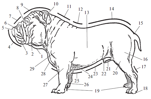 Голова. Череп достаточно широкий, большой, глубокий (его окружность перед ушами равна высоте собаки в холке). При осмотре спереди череп высокий, широкий, квадратных очертаний (от вершины черепа до угла нижней челюсти). При осмотре сверху голова широкая и короткая (ширина черепа значительно больше ее длины), а сбоку – очень высокая и короткая. Затылочный бугор не выражен. Череп плоский и не заходит за щеки. Кожа на лбу и на голове сырая, покрыта множеством морщин. По средней линии лба (от переносицы до середины лба) имеется плотная складка кожи («ремень»), а под ней – неглубокая лощинка, тянущаяся до вершины черепа. Надбровные дуги выпуклые и широкие. Переход к морде резкий и глубокий. Щеки хорошо выражены, округлые. Скулы выпуклые, расширяются за глазами. Морда короткая, с глубокими морщинами и складкой на переносице, широкая, глубокая, квадратных очертаний, склоненная вниз. Мочка носа крупная, широкая, черного цвета, зеркальце глубоко приплюснуто (до самых глаз). Расстояние от середины переносицы до кончика носа меньше длины от конца носа до подбородка. Ноздри большие, широкие, хорошо раскрыты, так что в движении собака не должна задыхаться и хрипеть. Верхняя губа толстая, мясистая, широкая, расходится от перегородки под тупым углом, сырая, глубоко свисающая, красиво закруглена. При осмотре сбоку хорошо закрывает нижнюю челюсть с боков, а спереди – доходит до каймы нижней губы, полностью закрывая зубы. Челюсти широкие, массивные и квадратные, с хорошо развитым, широким и массивным подбородком. Нижняя челюсть широкая, выдвинута вперед по отношению к верхней и ладьей изогнута вверх над альвеолярными отростками верхней челюсти, чрезмерно возвышаясь над ними. При осмотре сбоку подбородок, мочка носа и лоб находятся на одной линии.