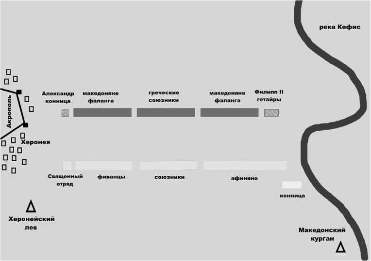 Греческие стратеги не стали заниматься тактическими изысками, а построили армию в одну линию – на правом фланге встали афиняне, в центре союзники, на левом крыле расположились фиванцы. Правый фланг боевых порядков эллинов упирался в реку Кефис, левый практически соприкасался с Херонеей и был прикрыт небольшой речушкой Гемон. Таким образом, эллинские военачальники исключили возможность охвата своих флангов македонской конницей и свели сражение к фронтальному столкновению. Филипп разгадал замысел противника и вопреки традиции сосредоточил отборные войска на левом фланге, который сам и возглавил. Его сын Александр в сопровождении опытных военачальников командовал правым крылом, середину строя заняли союзники македонян.