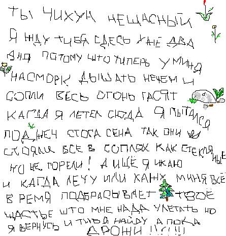 А дома его ждало нечто. Земля перед пещерой была вся исцарапана глубокими бороздами. Чародей долго и внимательно смотрел на эти борозды и понял, что они складываются в буквы, буквы в слова, а слова в послание. Он поднялся над землёй на небольшую высоту и оттуда стал читать. Написано было, как дракон лапой, собственно говоря, дракон это лапой и писал.