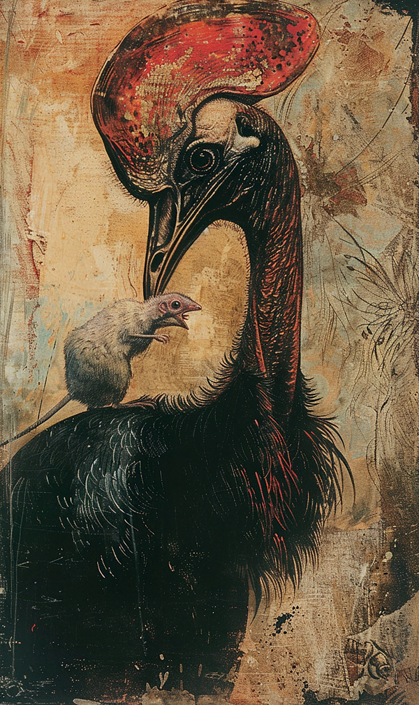 На самом деле, похоже, сознание его не угасало, скорее всего, переходило из одной формы в другую, переключались какие-то фазы. Он стал уменьшаться, это было что-то новое, необычное, но полностью не исчез; на каком-то этапе перестал терять объём тела и превратился в мышь; ощущать себя мышью оказалось приятно и даже радостно. Какая разница, в какое животное ты обернулся? Из предыдущего сна помнил, что оборотнем быть весело. Он встряхнулся и быстро побежал, маленькие мышиные лапки работали уверенно, ими было приятно управлять. Забежал под шкаф – там оказалось отверстие, ведшее в нору, про неё он раньше ничего не знал. В норе тепло, она расширялась. Надо было зачем-то бежать вперёд. Становилось всё светлее. Неожиданно он понял, что это свет тревожный – таким мигают лампочки, сопровождающие звук сирен. А ещё он осознал: это горит красным шишка на голове гигантского казуара, страшной и опасной птицы. Ещё эта шишка жужжала и искрилась, как старинная электрическая лампа. И вращалась, как стробоскоп на крыше милицейской машины.