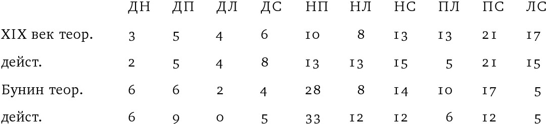 В корпусе 5-ст. хореев XIX века, если отсеять из них пародии, публицистику, эпические и декоративно-экзотические стихи, останется 91 стихотворение, допускающие выделение мотивов Д(орога) – Н(очь) – П(ейзаж) – С(мерть) – Л(юбовь). В корпусе Бунина, если отсеять эпические и экзотические тексты, останутся 49 стихотворений. Если подсчитать, сколько раз зафиксирован каждый мотив, то получится: в XIX веке соответственно 12, 27, 41, 52 и 34 раза, у Бунина – 7, 30, 34, 18 и 10 раз. Процентное соотношение Д: Н: П: С: Л для XIX века – 7:16:25:32:20 %, для Бунина – 7:30:35:18:10 %. Уже эти цифры показательны: видно, насколько у Бунина больше Ночи и Пейзажа и меньше Любви и Смерти.