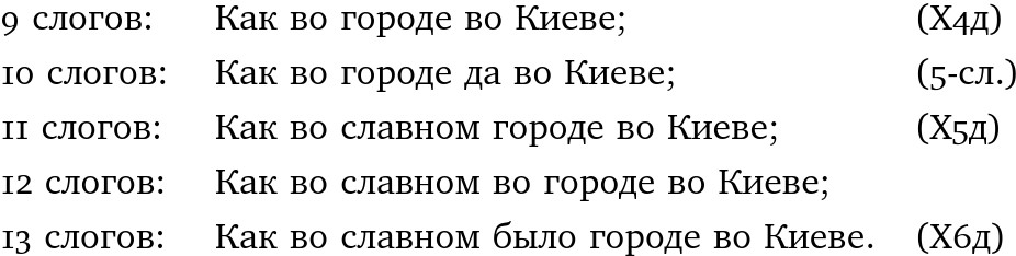 Итак, А) размеры народного происхождения. Общий их источник – эпический стих русских былин, исторических песен, духовных стихов, в меньшей степени – стих лирических песен. Он развился когда-то из общеиндоевропейского 10-сложного размера, но в ходе этого развития утратил равносложность и стал сочетать строчки разной длины, но почти всегда с дактилическим окончанием. Так, одну и ту же строчку, пользуясь «восполнительными» словами и частицами, можно спеть: