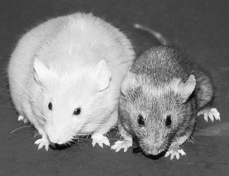Мать крысы слева (ее окрас ярко-желтый, крыса с избыточной массой тела) получала обычное питание.