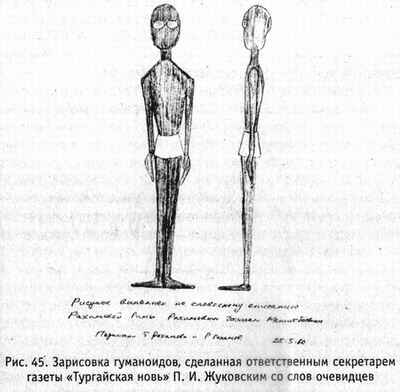 Жуковский уточнил, что произошло все это 26 июня 1979 года, между 11.15 и 11.40 местного времени. Отряд (около 20 пионеров 5-7-х классов), находясь на прогулке вместе с пионервожатой Н. П. Колмыковой, на сопке Лысой в 2 км от лагеря встретил четырех неизвестных существ очень высокого роста и хрупкого телосложения. Они были черного цвета, в районе бедер подобие юбки. На лицах не было видно ни носов, ни ртов, только два больших «глаза» розового цвета (рис. 45).