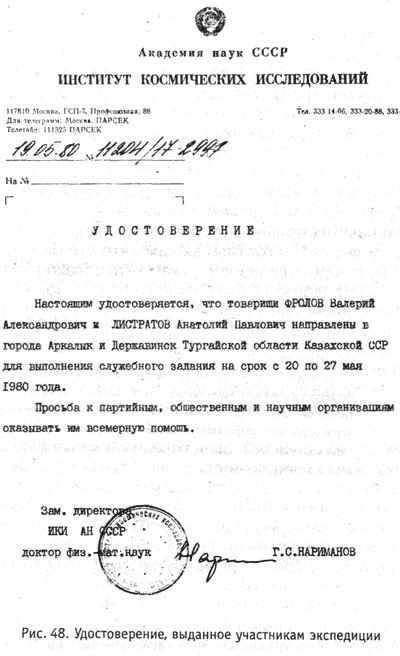 «Естественно, я готовил эти документы, чтобы организовать экспедицию, и предоставил справку Нариманову,– рассказал Листратов. – Настала весна, был звонок в обком партии Тургайской области по „вертушке", была солидная бумага нам выдана, нашли место, где нам остановиться. И вот в конце мая, через 11 месяцев после происшествия, мы выехали. Планировалась группа из трех человек, но опять же отношение к проблеме привело к тому, что сотрудника физического института не отпустило руководство. Мы поехали вдвоем: я и сотрудник ИКИ… (рис. 47, 48).